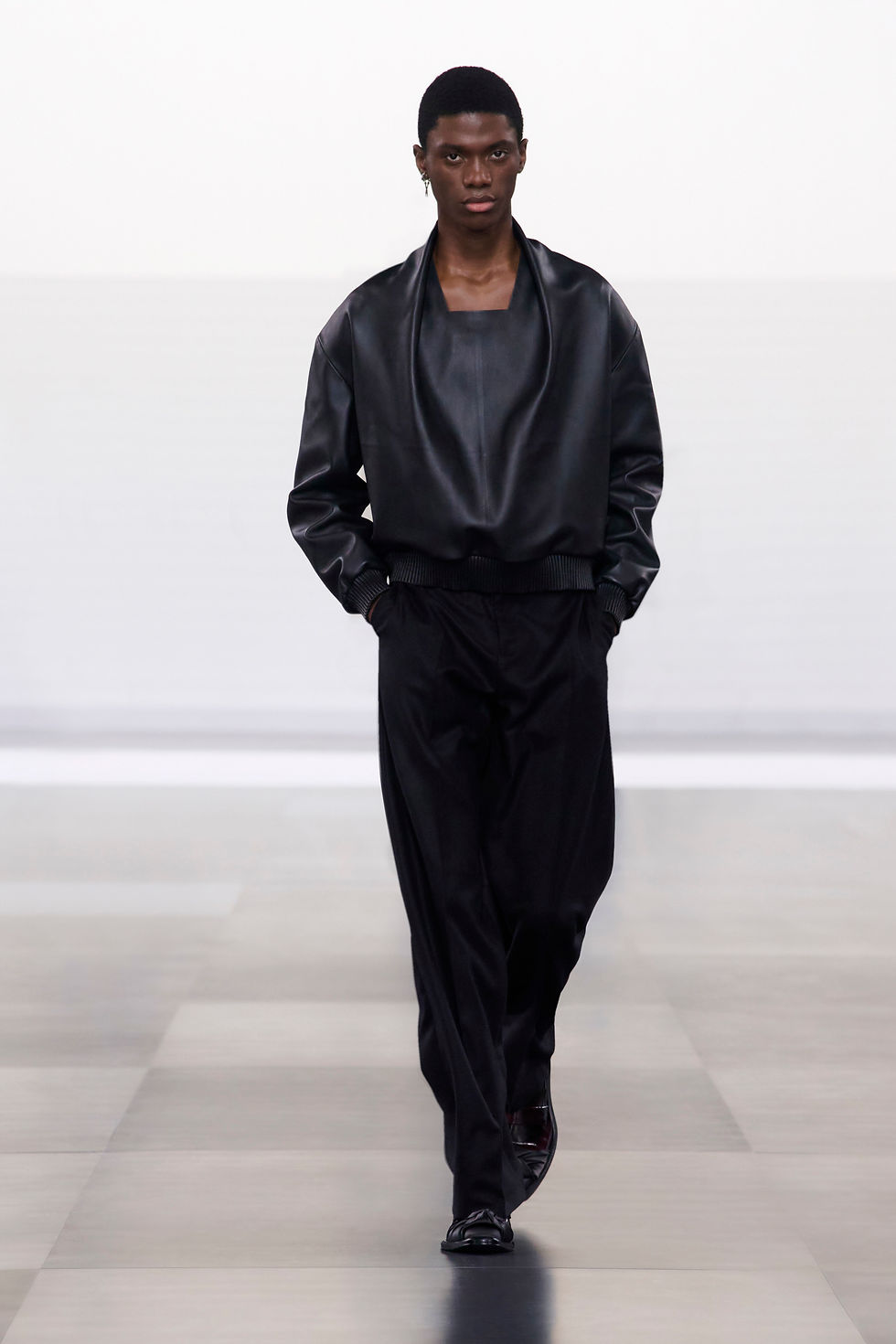 From the very opening of the show, the language of couture seeps into menswear. Those robe-like shapes borrowed from the women’s archive, the opera coats, the belted and exaggerated volumes… There is a controlled opulence in the movement of the fabric and in the drapery where the light slides over satin and silk. The aristocratic shine of these materials never turns romantic. Under Jones’s strict discipline it becomes something cooler and more masculine. The silhouettes are striking without trying to show off, almost sculptural.